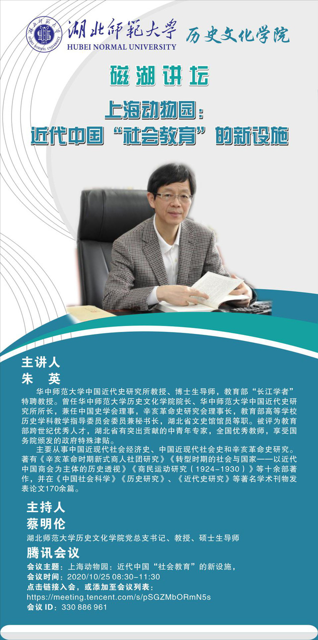 2020年10月25日上午8点30分,教育部“长江学者”特聘教授、华中师范大学教授、博士生导师朱英应邀在腾讯会议为yl23455永利官网师生开展了一场题为“上海动物园:近代中国‘社会教育’的新设施”的学术讲座,讲座由yl23455永利官网蔡明伦教授主持。yl23455永利官网张泰山、李柏林等老师与150余名学生共同在线聆听。