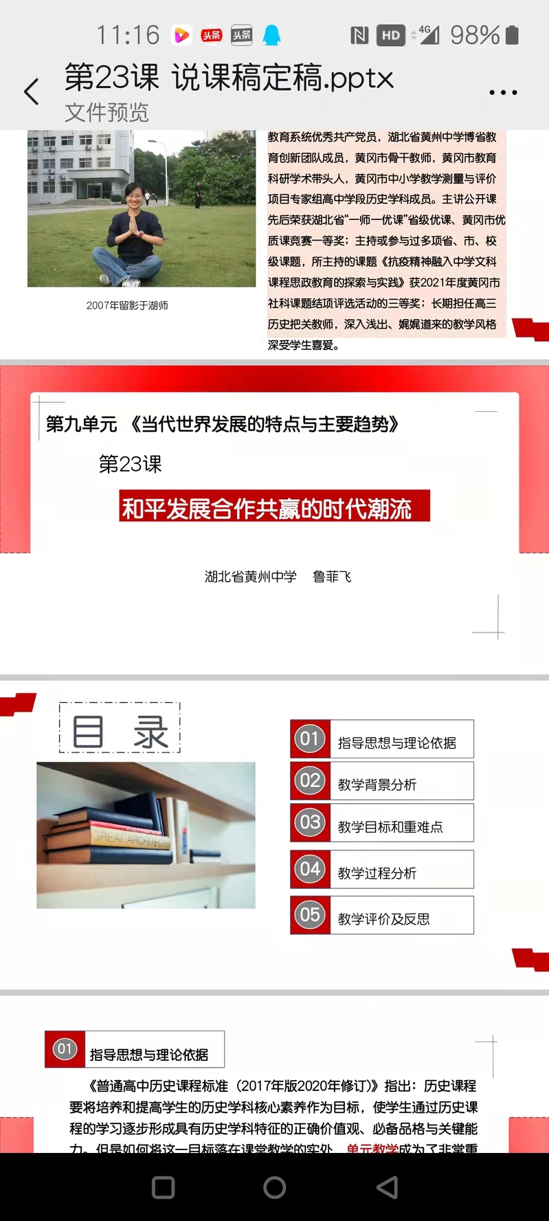 鲁老师选择了中学老师公认的不太好讲的一课——第九单元当代世界发展的特点与主要趋势第23课和平发展合作共赢的时代潮流作为说课对象,她采用课后说课的形式从教学目标与理论依据、教学背景分析、教学重难点、教学过程分析、教学评价与反思五个方面进行了说课,传导了她比较先进的教学理念和特色鲜明的教学设计。