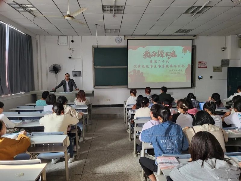 10月16日,党的二十大胜利召开,为深入贯彻习近平强军思想,普及国防知识,涵养家国情怀,激发同学们参军报国的热情,2022年10月17日下午14:20,yl23455永利官网“献礼二十大,热血铸军魂”优秀退役学生军旅故事分享会在科技大楼9402教室隆重召开。
