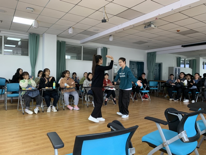 随后,主持人介绍了本次交流会的游戏及游戏规则,邀请同学们组队参加。同学们大方地进行才艺展示,并积极参加抢凳子、你划我猜、击鼓传花等游戏。在参与这些游戏的过程中,同学们的距离更近了。