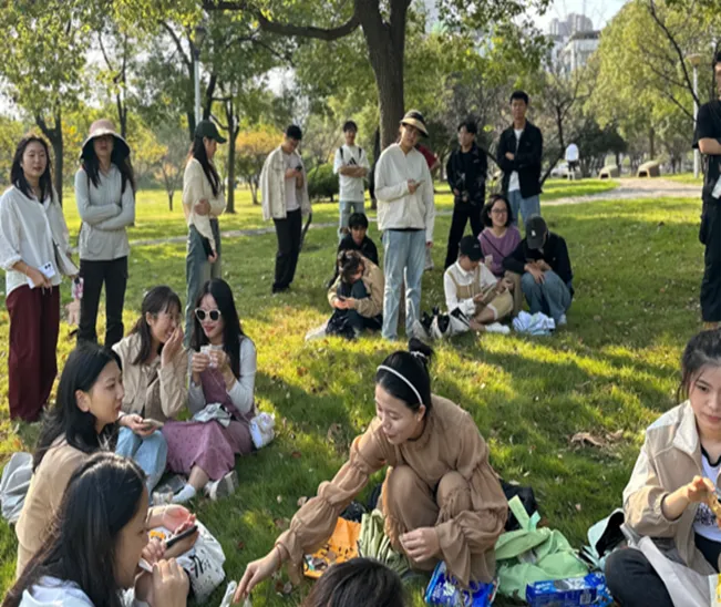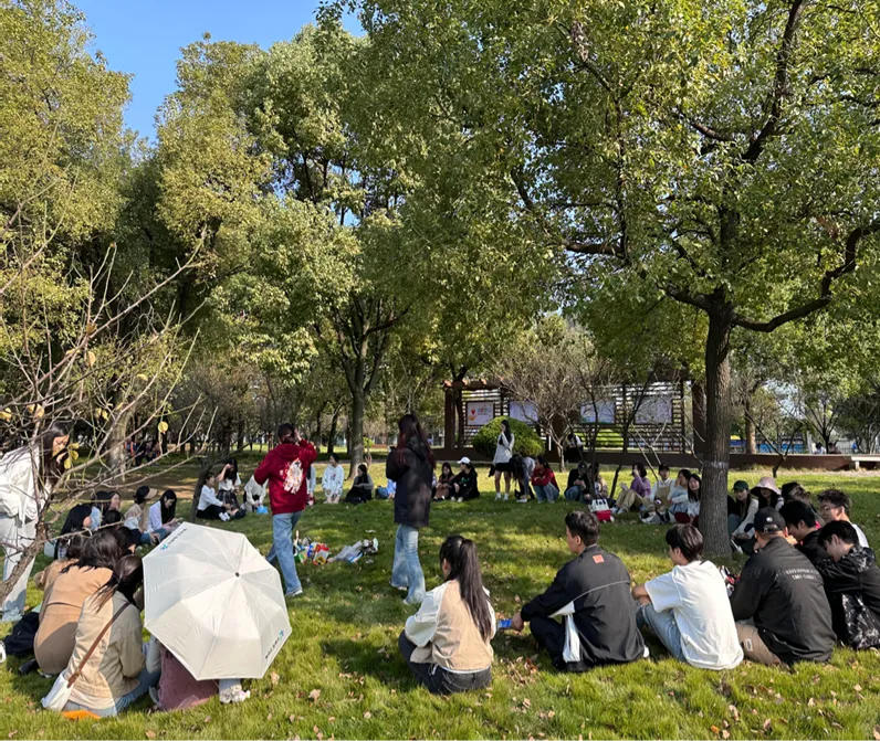 为了让同学们先熟悉彼此,首先选择了击鼓传花的游戏,先组织同学们形成一个圈坐下来开始传递,音乐停止后传递的物品在哪个同学手上就需要选择真心话或者大冒险;随后,在班长和组织委员的组织下,大家一起玩“贴膏药”游戏,在你追我跑中彼此更加的熟悉,期间大家欢声笑语;最后,大家坐下休息自由活动,经过前面的游戏许多同学已经相互认识,开始自主组织游戏,也有许多同学在公园拍照,享受秋日太阳的温暖。
