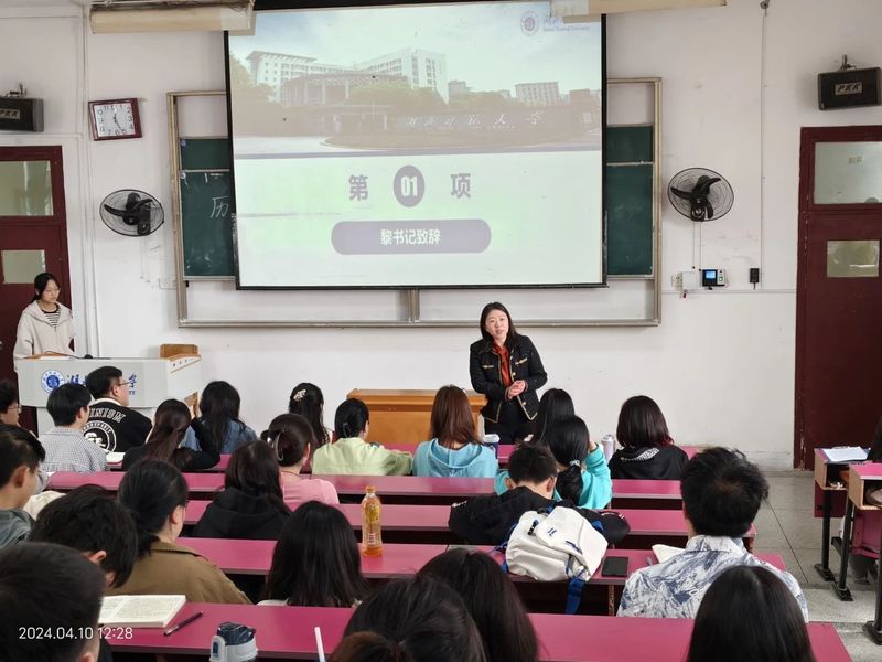 会议第一项,党委副书记黎老师上台发言。首先,黎老师强调了电动车骑行的安全问题,并提醒学生及时办证。其次,黎老师关注学生心理健康发展,鼓励学生学会自我调节心理,勇于直面问题、解决问题,处理好班级关系、寝室关系,增强团结意识,凝聚向上力量。此外,黎老师还着重强调要注重学业学习,积极与老师沟通,学好专业课。