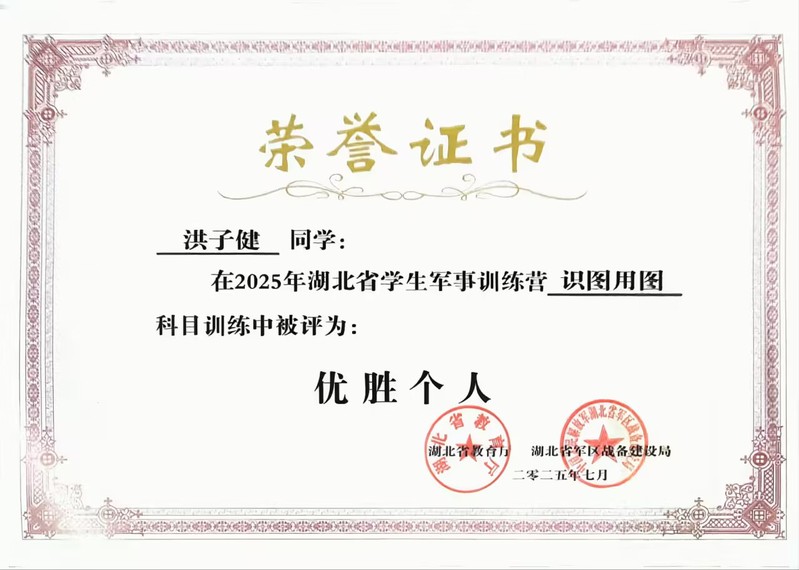 yl23455永利官网洪子健同学,在2025年湖北省学生军事训练营识图用图科目训练中被评为优胜个人!