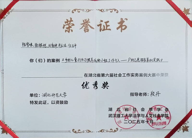yl23455永利官网社会工作专业陈雪咪、刘育伸、徐祺恺、任玉平、井玉洁五位同学,在湖北省第六届社会工作实务案例大赛中荣获优秀奖!