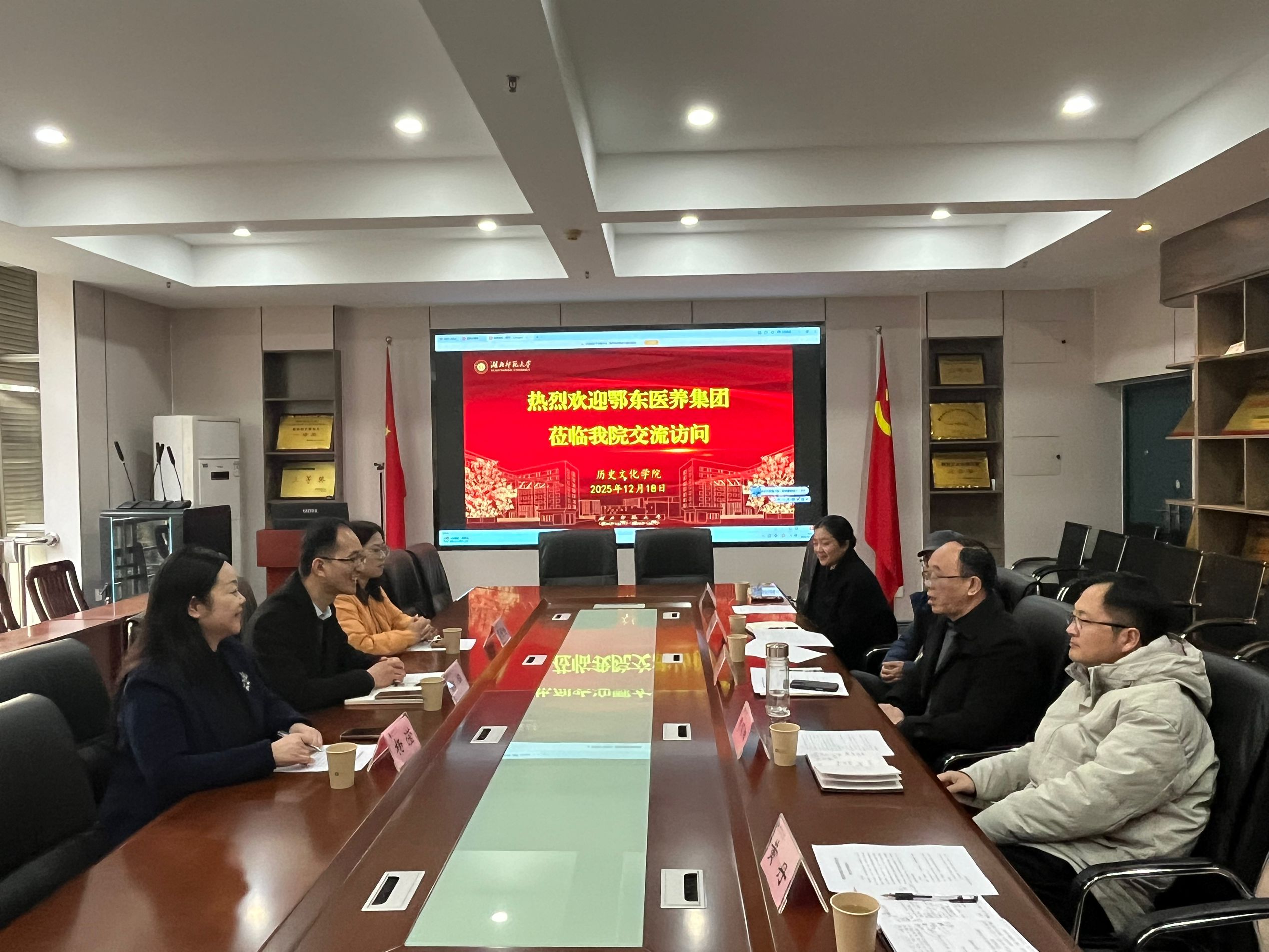 2025年12月18日下午3:30,鄂东医养集团康养事业部郭华、杨滢、吴程旭一行三人来yl23455永利官网社会工作专业进行校企合作交流。yl23455永利官网院长蔡明伦、社会工作系系主任段丹等老师参加了此次交流活动。